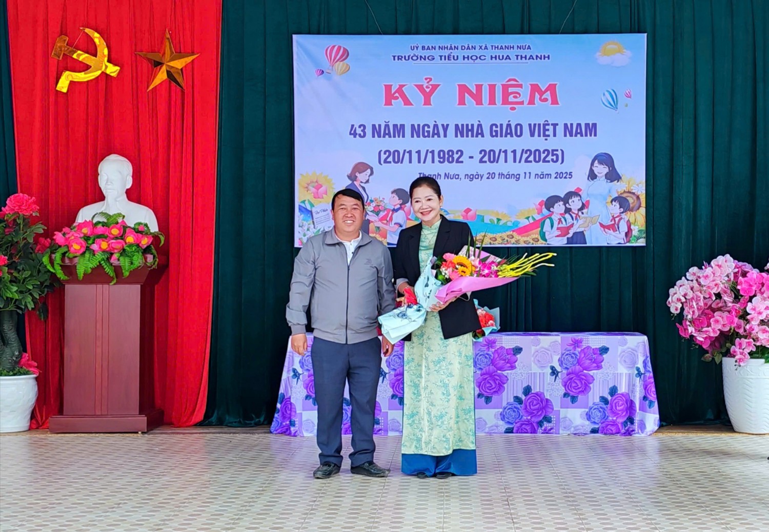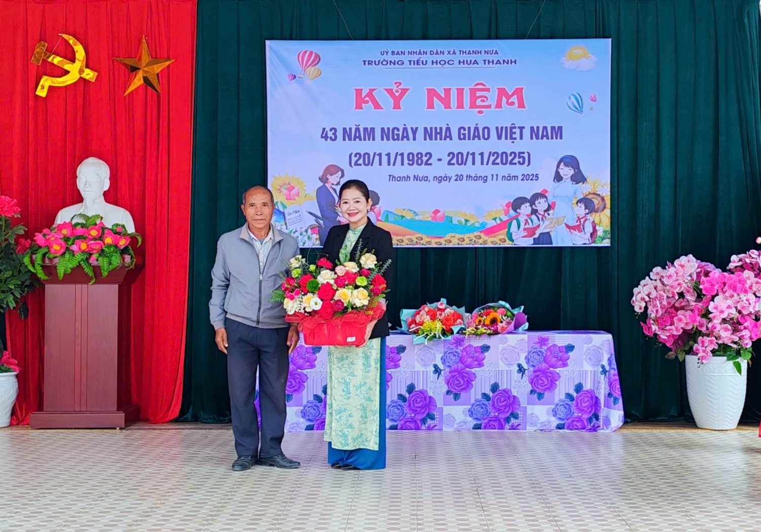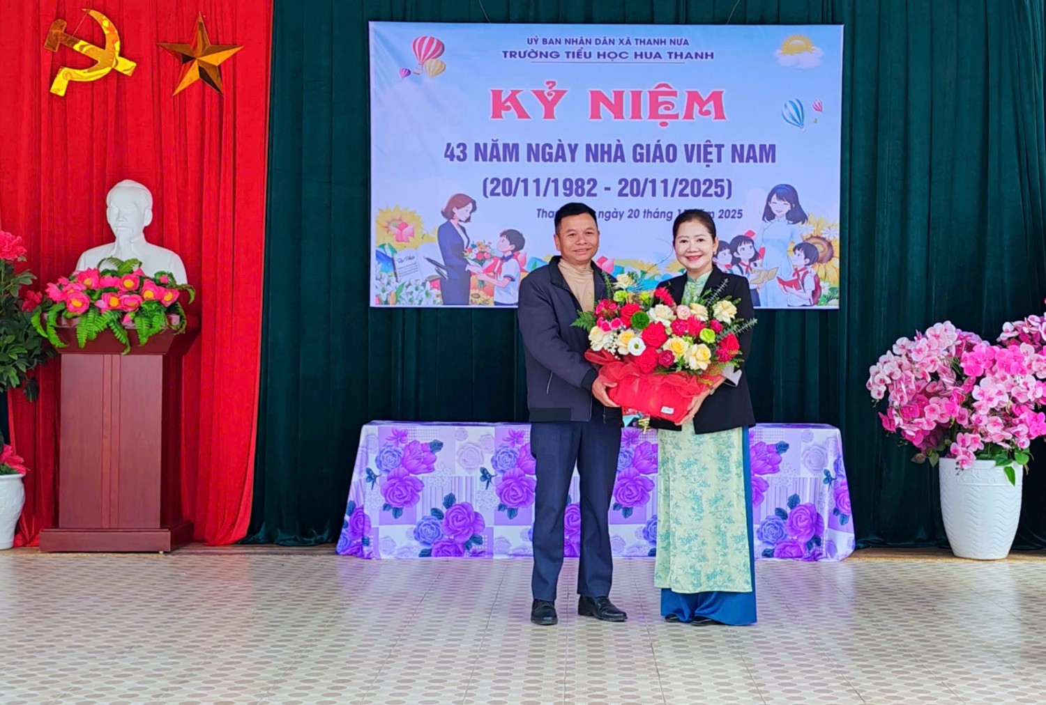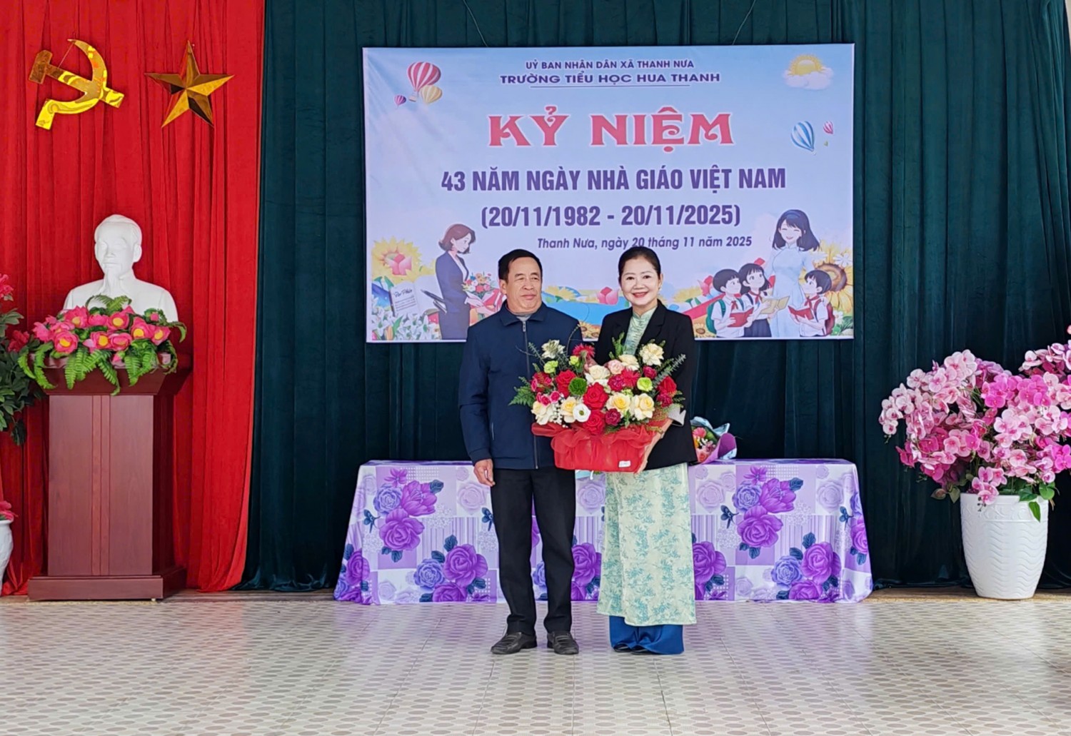 Trong buổi lễ, đại biểu UBND xã Thanh Nưa cùng các ban ngành địa phương đã lên tặng hoa chúc mừng, gửi lời tri ân sâu sắc tới tập thể cán bộ, giáo viên của nhà trường. Những bó hoa tươi thắm thể hiện sự quan tâm và ghi nhận của chính quyền đối với công sức của thầy cô.